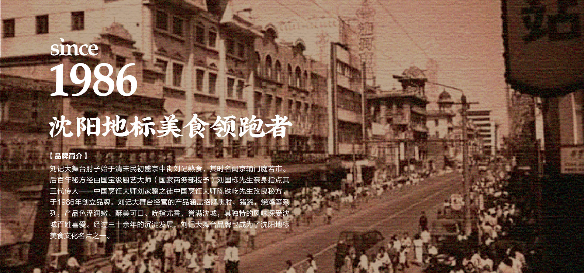 盛京,昔乃大清王朝發(fā)祥之地。劉記大舞臺肘子始于清末民初盛京中街劉記熟食,其時名聞京輔門庭若市。后百年秘方經(jīng)由國寶級廚藝大師(國家商務(wù)部授予)劉國棟先生親身指點(diǎn)其三代傳人——中國烹飪大師劉家驥之徒中國烹飪大師陳鐵屹先生改良秘方,于1986年創(chuàng)立品牌。劉記大舞臺經(jīng)營的產(chǎn)品涵蓋招牌熏肘,豬蹄,燒雞等系列,產(chǎn)品色澤潤嫩、酥美可口、吮指尤香、譽(yù)滿沈城,遂成古今絕味,其獨(dú)特的風(fēng)味深受沈城百姓喜愛。經(jīng)過三十余年的沉淀發(fā)展,劉記大舞臺品牌也成為了沈陽地標(biāo)美食文化名片之一。